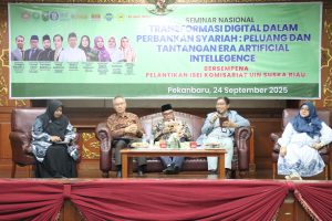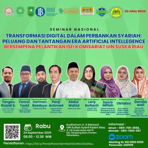 Pekanbaru (24/9/2025) – Ikatan Sarjana Ekonomi Indonesia (ISEI) Komisariat UIN Suska Riau bekerja sama dengan Program Studi Perbankan Syariah Fakultas Syariah dan Hukum UIN Suska Riau sukses menggelar Seminar Nasional bertajuk “Transformasi Digital dalam Perbankan Syariah: Peluang dan Tantangan Era Artificial Intelligence.”